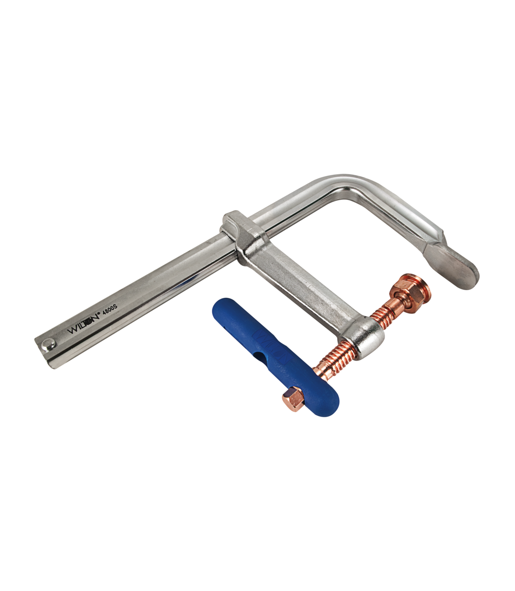 The top of the line Wilton® Spark-Duty TM series with copper spindle is superior when resisting welding spatter. Every Spark-Duty F-Clamp comes standard with an ergonomic, anti-fatigue Wilton-Grip® and V-Groove pad accessory. Boasting a lifetime warranty, the 4800S series F-Clamps clamp down with 4800 pounds of force.