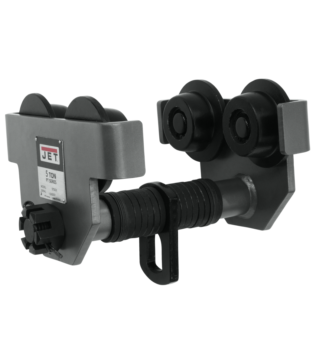 JET® PT Series heavy duty Manual Trolleys are available in capacities from 1/2 ton to 10 Tons. Built with heavy gauge steel for increased durability, the large steel wheels and thicker bearings provide smooth movement on a variety of beams. The built in bumper guards increase user safety and extend the life of the trolley. Each JET® Manual Trolley conforms to OSHA regulations, and ANSI / ASME standards.