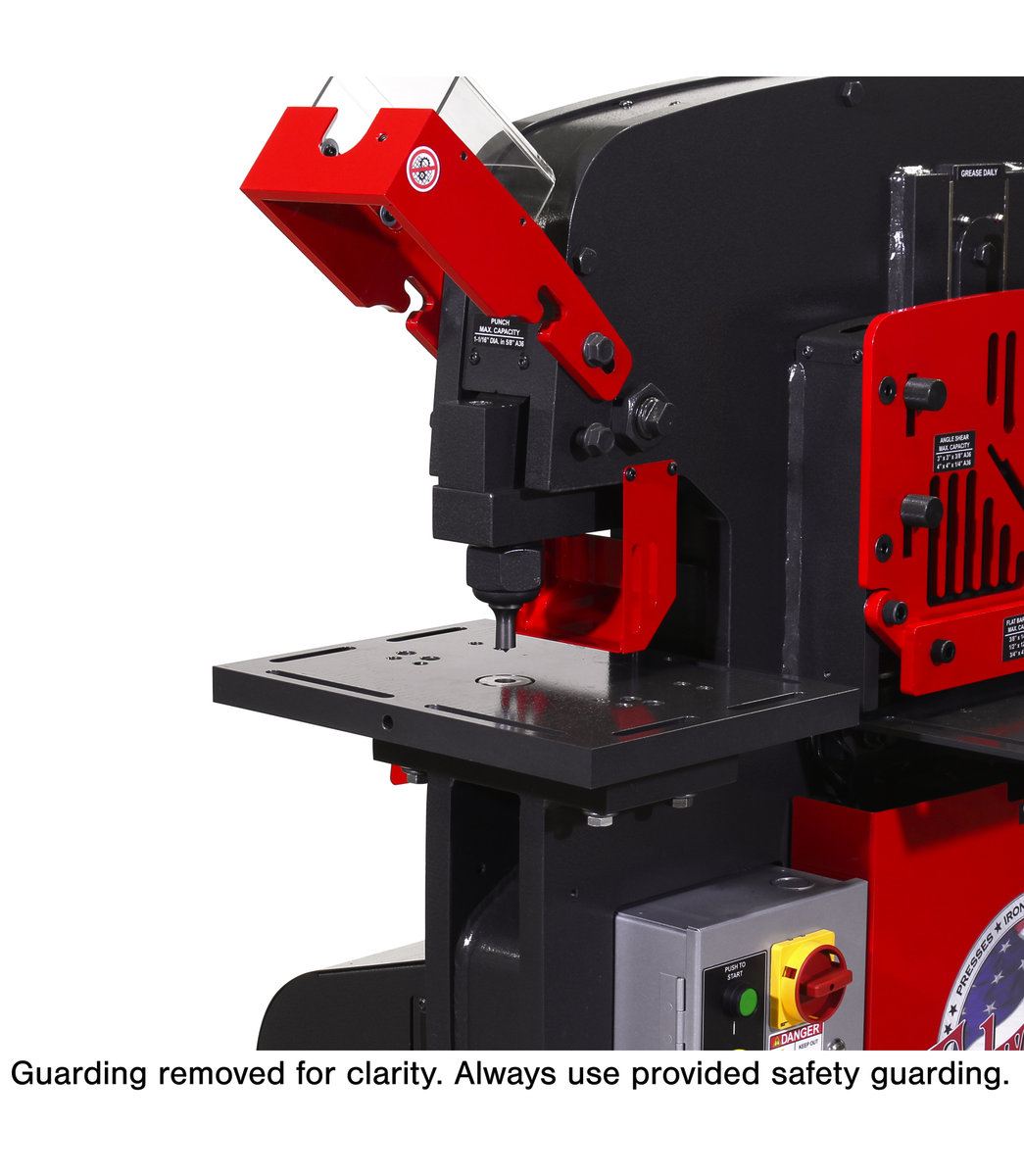 The 1" x 12" x 16" table the Standard Pedestal Die table to add speed and precision to your Punch Workstation. Compatible with the Edwards 40, 50, 55, 60, 65, 75, and 100 Ton Ironworkers (2013 & Prior). Includes adjustable fences and handles to quickly and easily guide your material for repeatable punching.