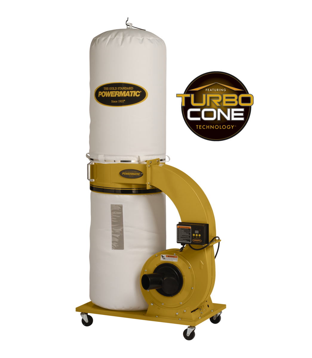 The PM1300TX Dust Collector features the exclusive TurboCone™ which improves chip separation to prevent clogging of the filter, and increases packing efficiency of the collector bag. The cloth filter bag is made of a 30 micron material which aids in the filtration of all but the finest dust particles, and the large capacity collection bag reduces the number of bag changes. A digital timer can be set for up to 99 minutes, and an infrared sensor allows remote control operation. The all-metal duct improves rigidity and air flow. Four swivel casters and conveniently located handles allow for easy mobility.